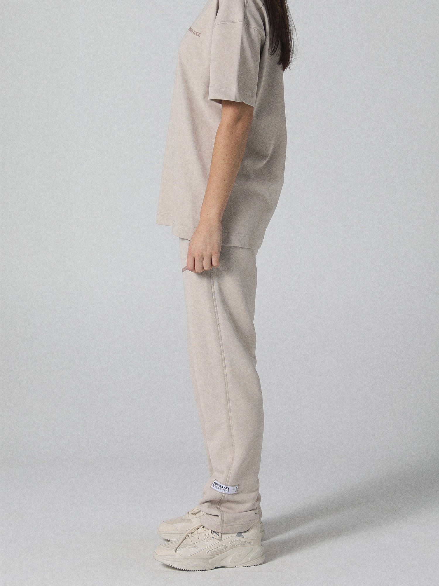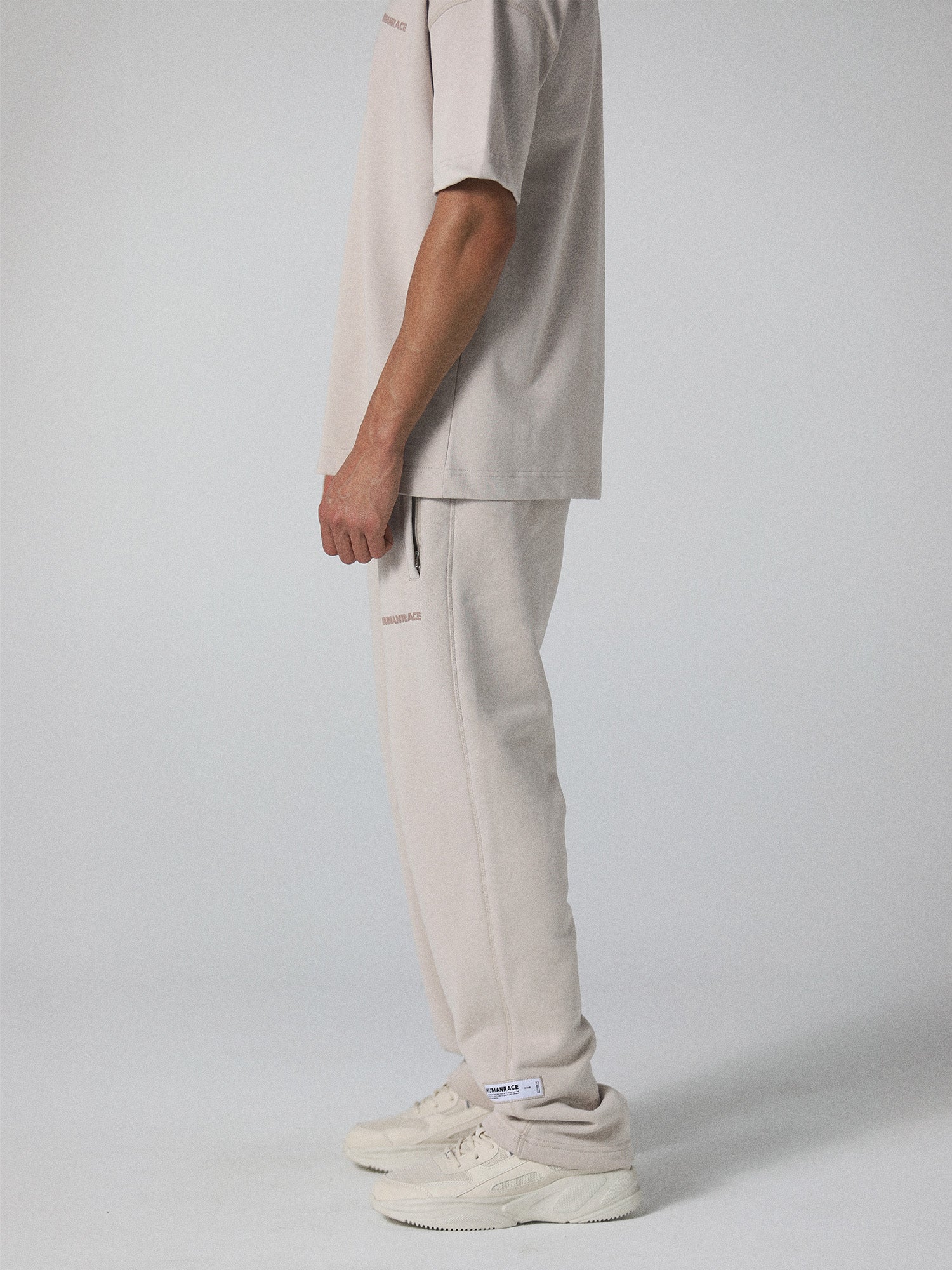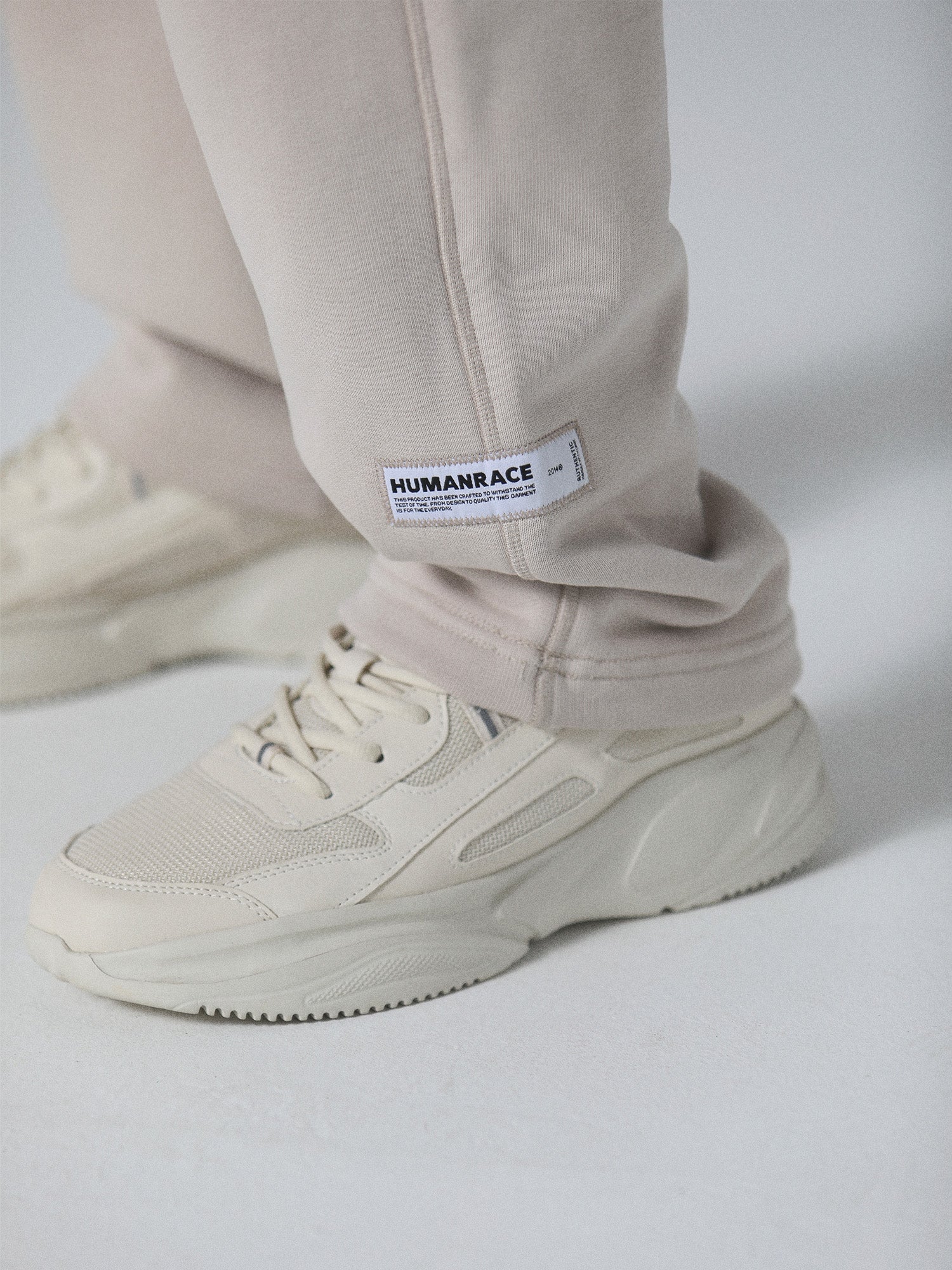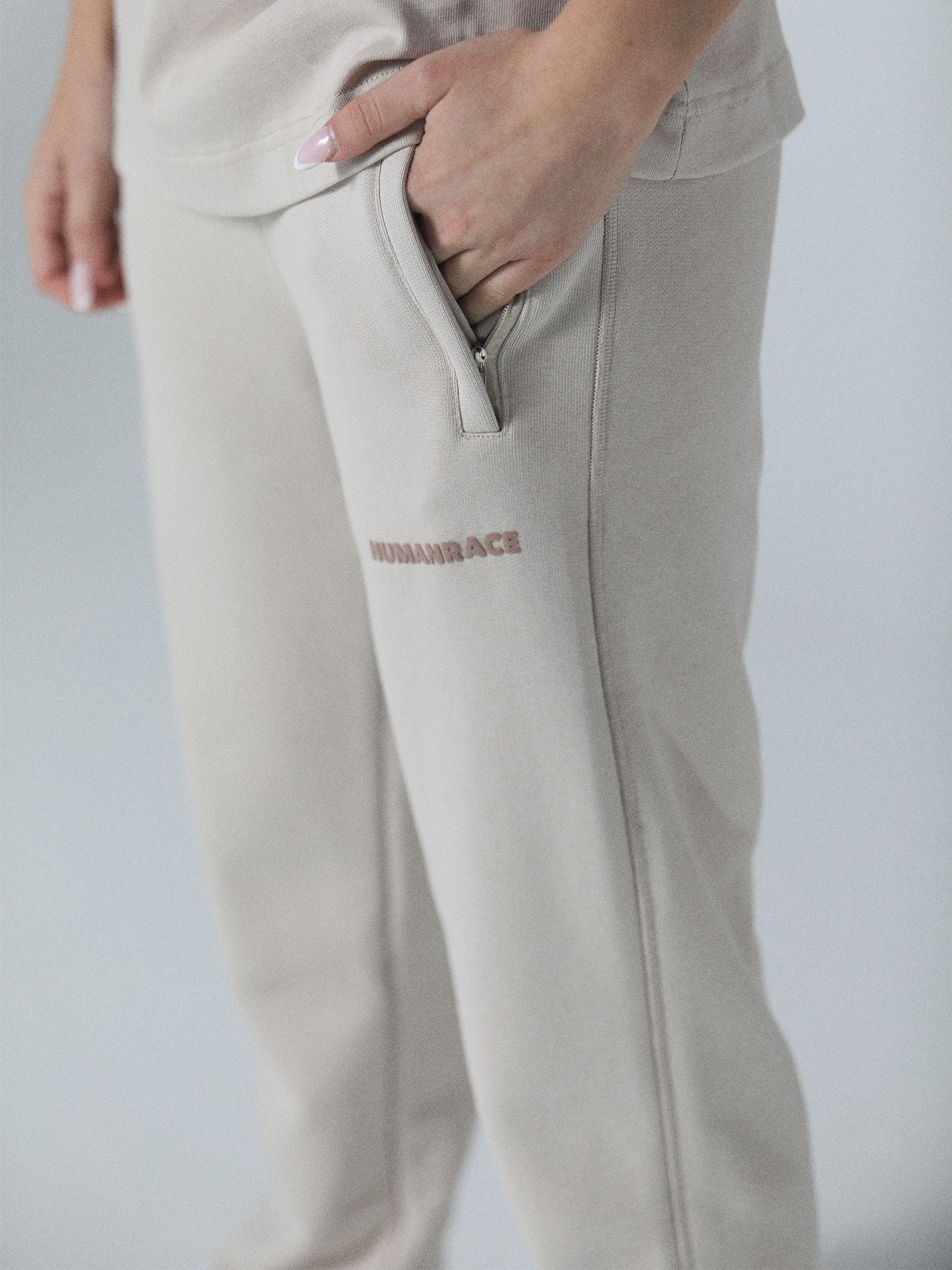 Introducing the Mars Pants in Deep Taupe, made from 100% organic cotton with a 550 GSM loopback fabric. These unisex straight leg jog pants feature a premium raised puff print 'HUMANRACE' logo on the front and an appliqué woven label with tonal stitching on the side seam. With an elasticated waistband, concealed drawcords, and zip pockets, the relaxed fit and overlock stitching make these pants both comfortable and stylish.